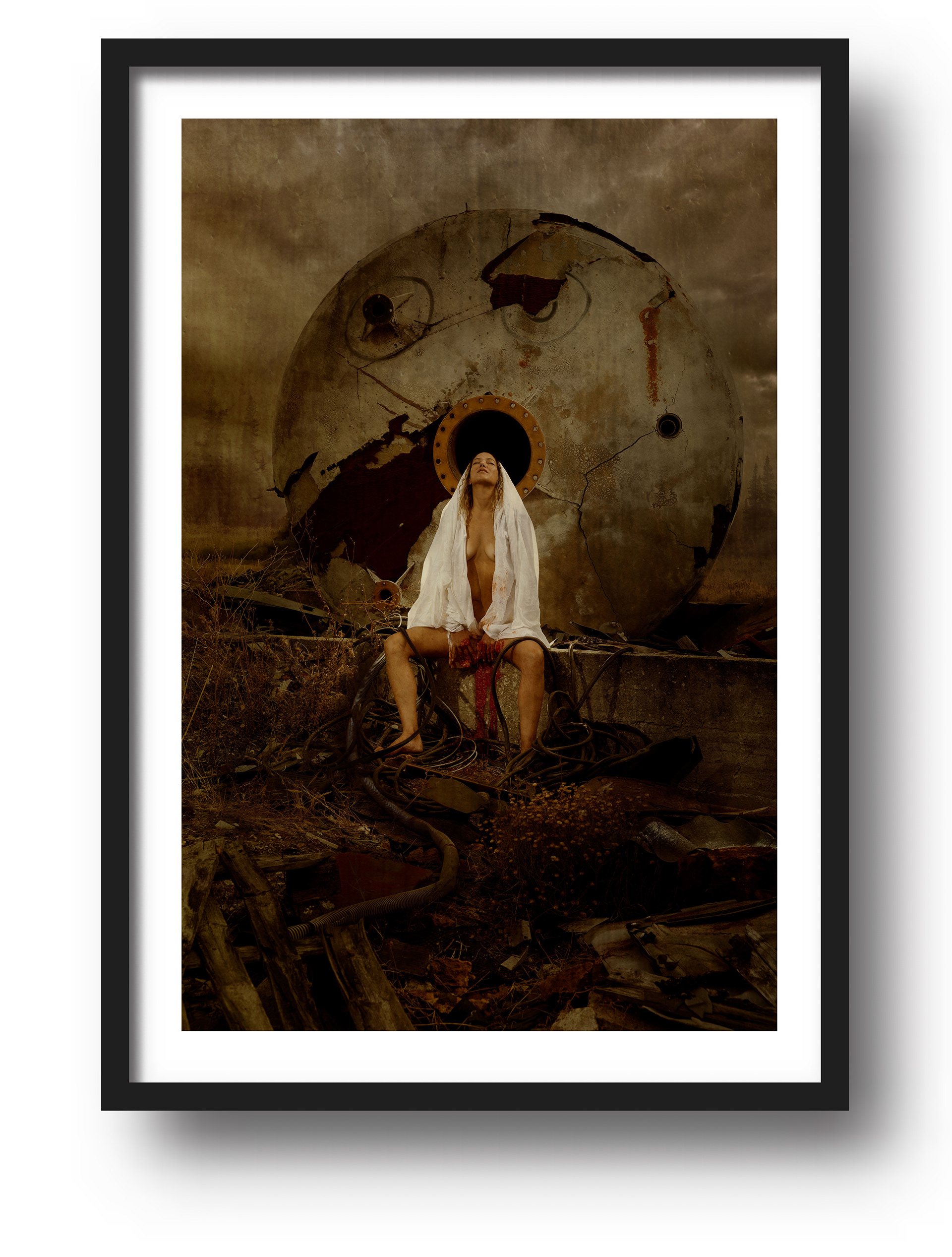 This work challenges us to reflect on how many wars have religion as their origin, set in a chaotic and apocalyptic scenario. In this powerful piece, a woman finds herself aborting the next god, alone in a world without hope. She rejects gods that symbolize war, yearning for a future where divinity and destruction do not coexist.