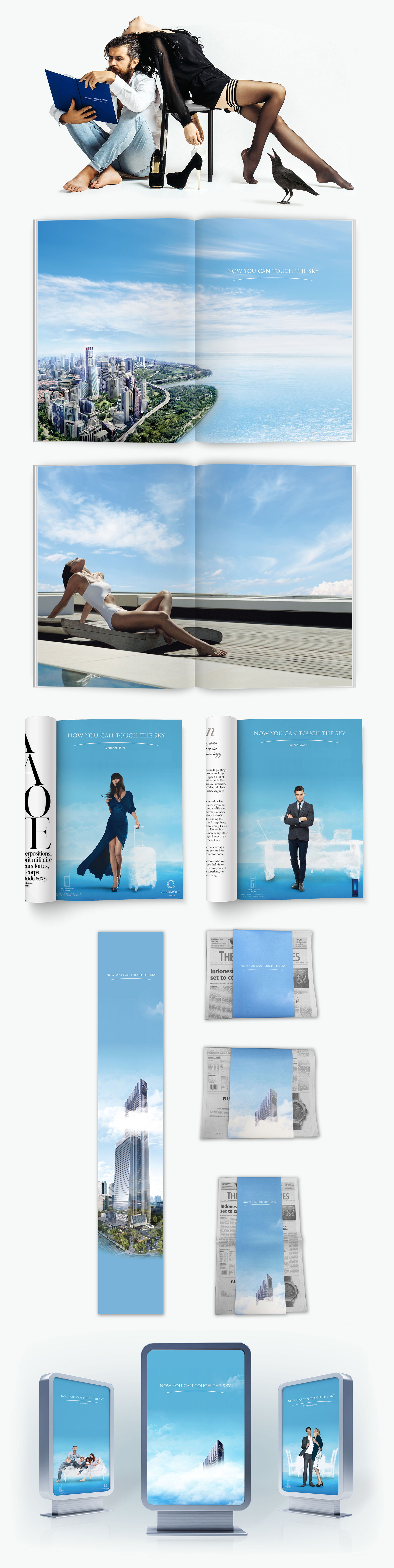 Apresentar o maior edifício de Singapura — o Tanjong Pagar Center — aos investidores, destacando suas quatro faces: residência, escritório, hotel e centro comercial. A melhor forma de mostrar essa maravilha da arquitetura é colocá-la exatamente onde ela merece estar: entre as nuvens. Em nossa campanha, cada elemento é criado a partir de um material semelhante às nuvens, reforçando a sensação de leveza e sonho. O conceito "Now you can touch the sky" (Agora pode tocar o céu) traduz exatamente o que esse edifício representa para Singapura: uma ambição elevada e uma nova perspectiva.